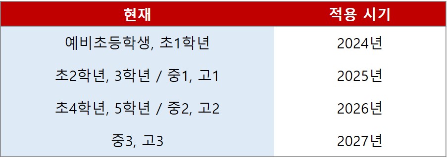 중학생들과 고등학생들은 모두 동일하게 1학년은 2025년에, 2학년은 2026년부터, 3학년은 2027년부터 적용된다.